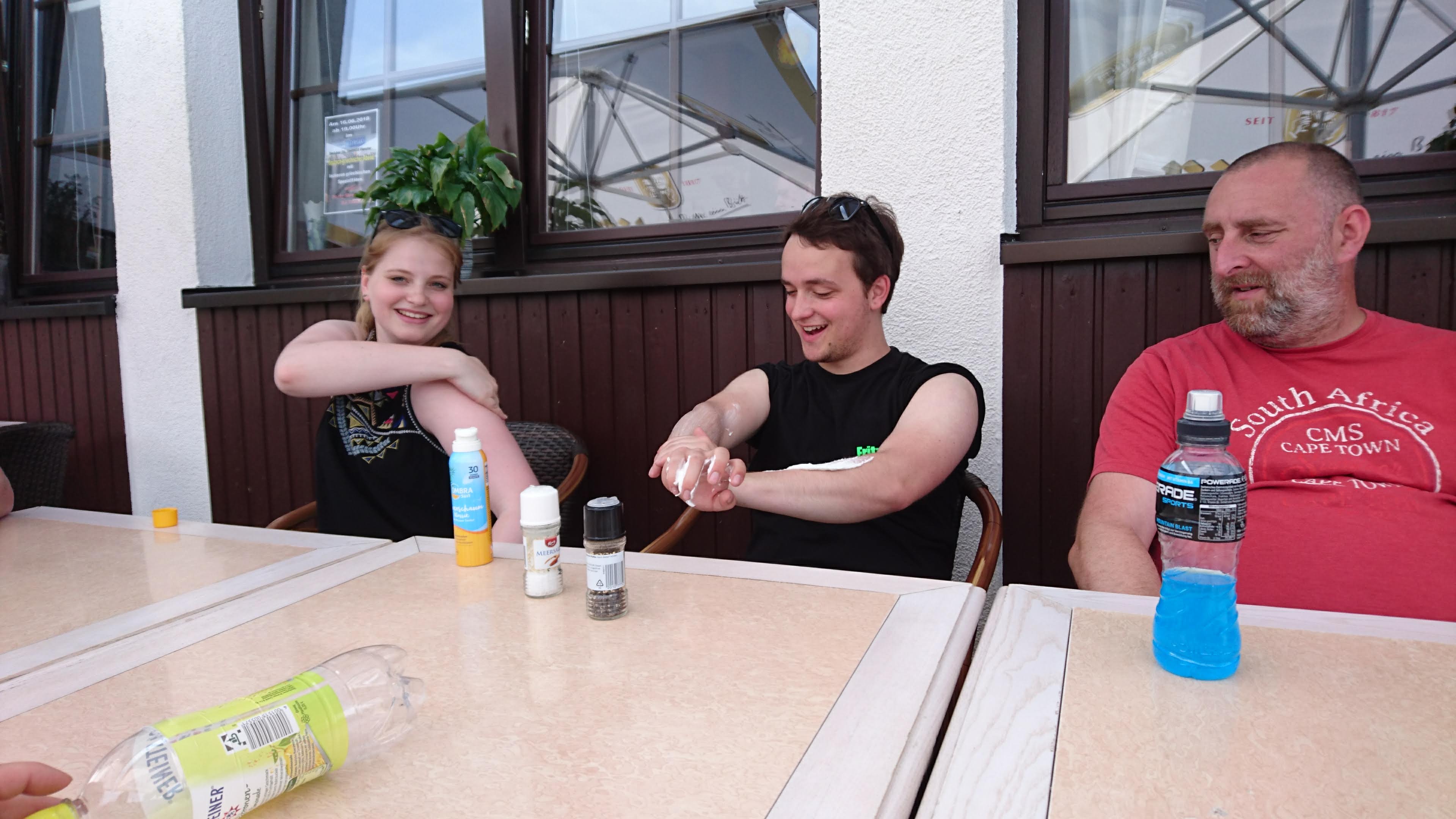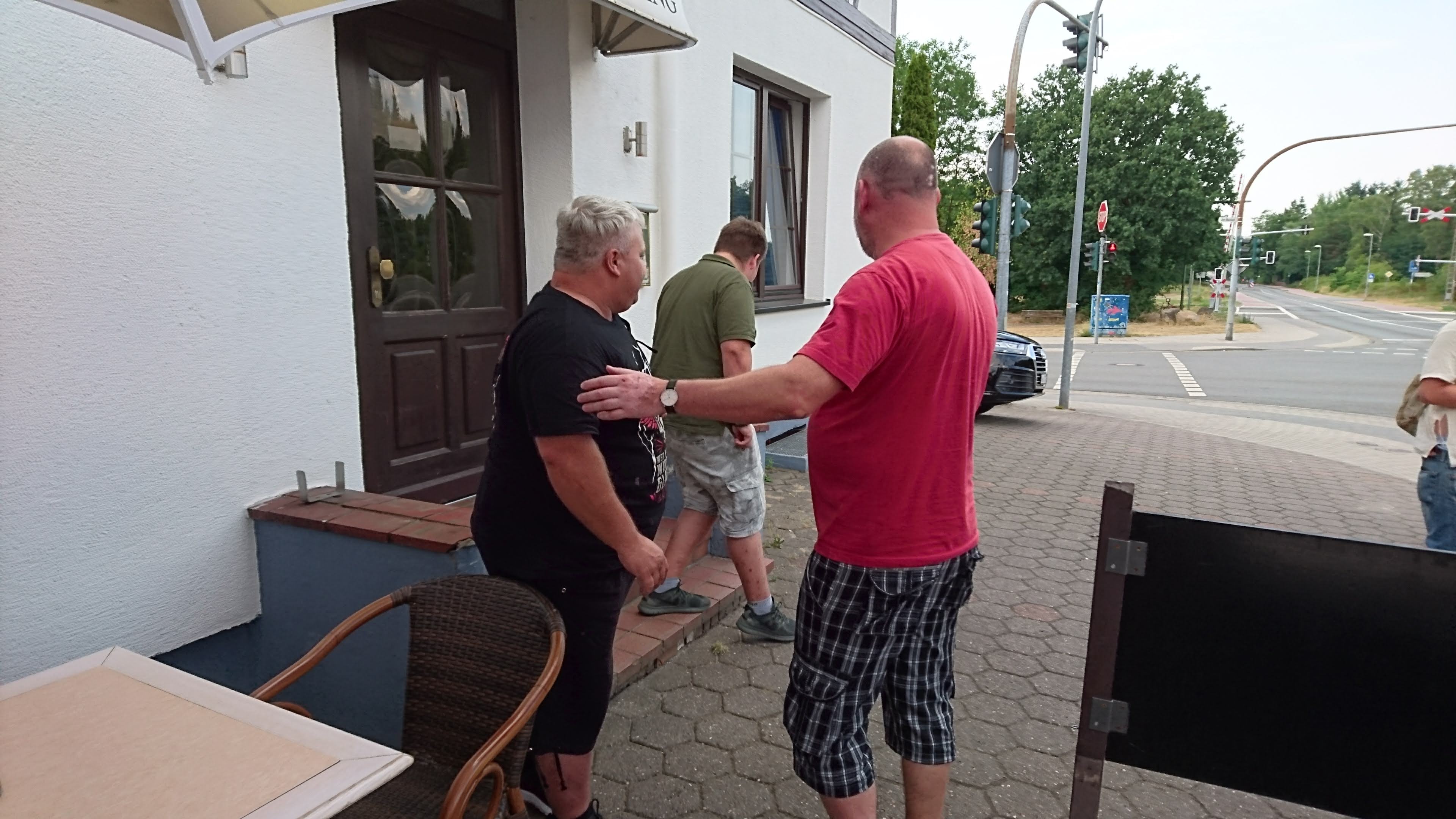 1401 – 1500. Es wurde beschlossen an einem dafür geeigneten Ort die Vorräte an Getränken aufzufüllen, für Laura eine kurze Hose zu kaufen und vielleicht Til irgendwie in ein Gespräch einzubinden. Bis auf letzteres gelang alles gut. Mit reichlich Energy und einer neuen, cremefarbenen kurzen Hose für Spielerfrau Laura, die sehr günstig im örtlichen Textildiscount erworben werden konnte, ging es weiter Richtung Innenstadt. Von Kapitano Jan war zwischenzeitlich eine Reservierung beim örtlichen Griechen ausgegangen und nach nur wiederum gefühlten 4 Stunden Fußmarsch durch die wunderschöne Lüneburger Heide eben diese Gastronomität auch erfolgreich erreicht.