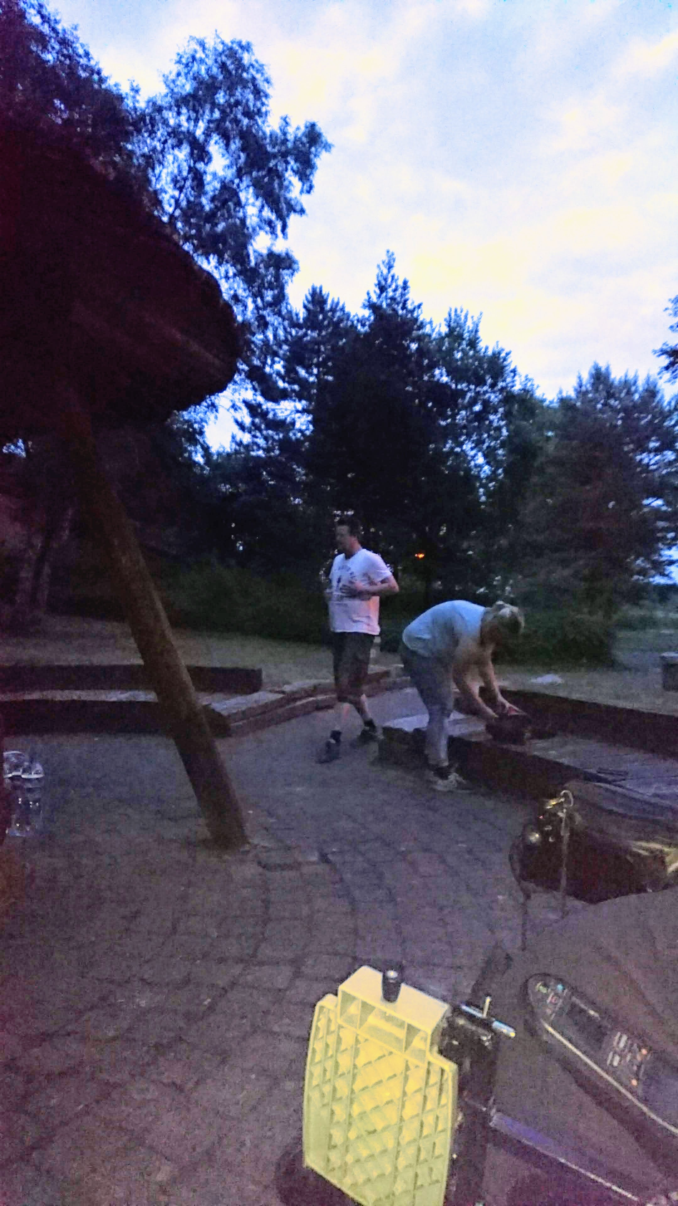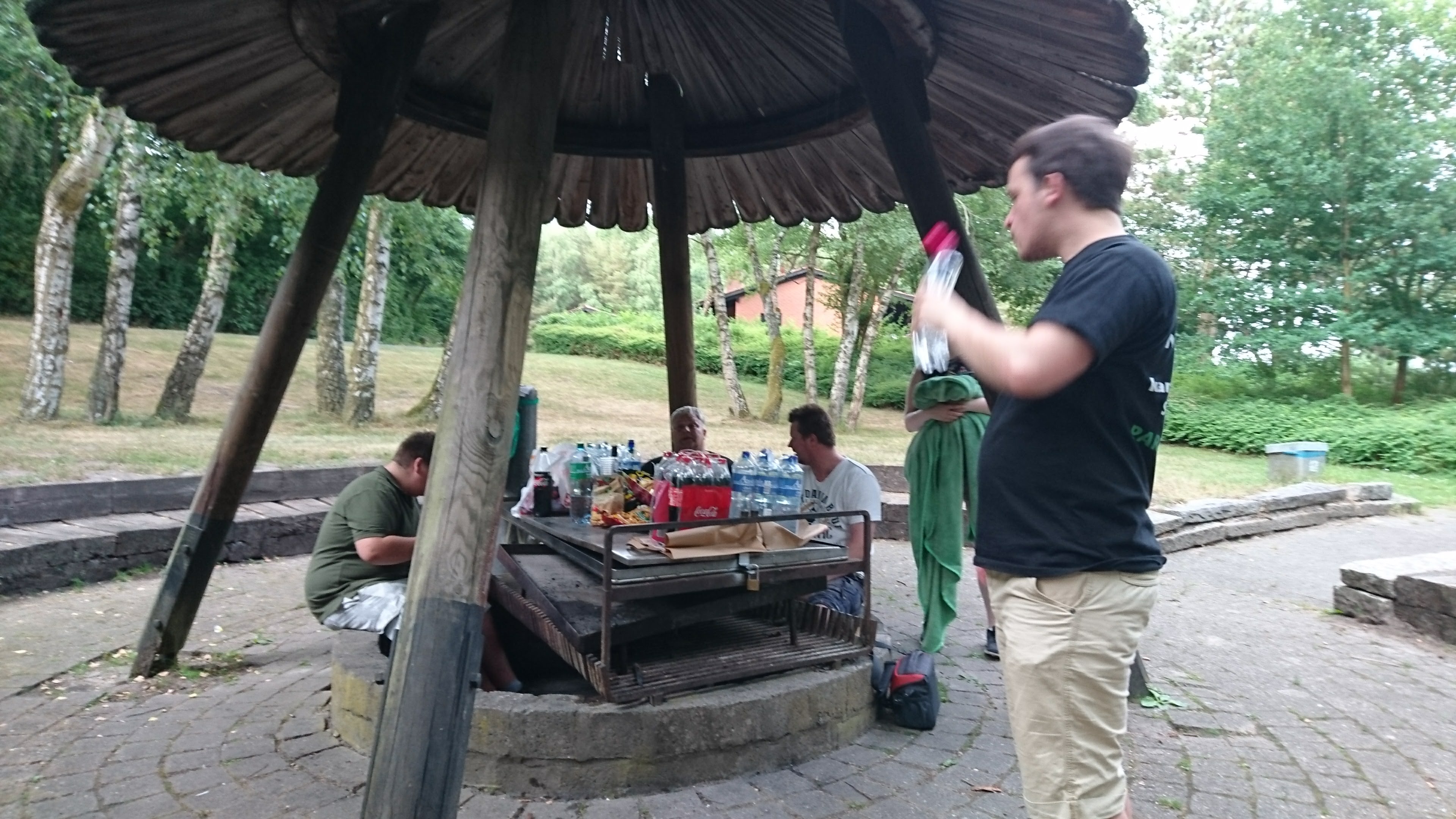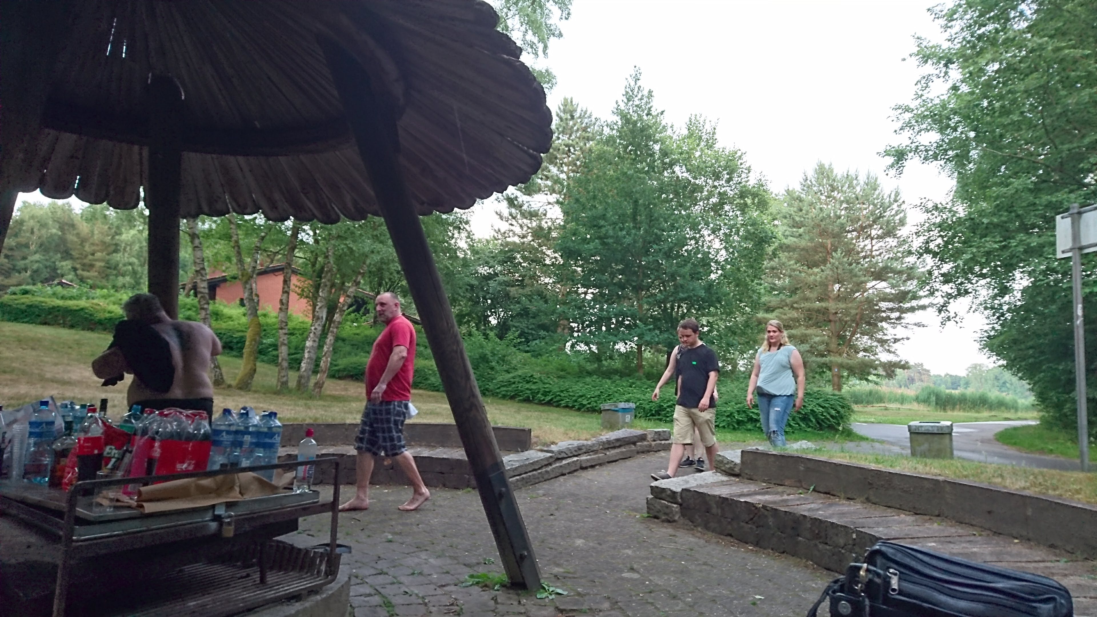 1830. Die Einkaufgruppe trifft mit Getränken, Knabbereien, Mückenspray und zwei unberührten Schönheiten am Grillplatz ein. Bei Jan und Jens lockert sich aufgrund der erfolgreich verteidigten Unberührtheit ihrer Begleitungen die Stimmung.